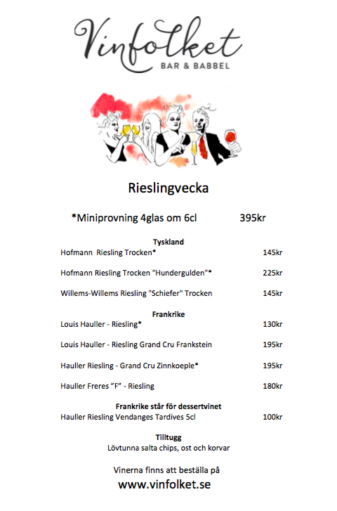Under denna sista vecka i augusti firar restauranger och vinbarer i hela landet Rieslingvecka. Ja, över hela världen...Så även Vinfolket!Dels med en alldeles speciell meny på vår bar i Stockholm, dels med ett exklusivt paket i webbshopen, där vi i en begränsad upplaga kan erbjuda en synnerligen spännande blandning på denna Tysklands mest spridda druva...Riesling ja. Faktiskt en av världens vanligaste druvor, och dessutom en av de sorter som ligger bakom flest olika typer av vin. Grö…